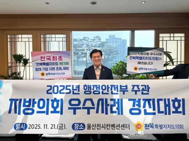 [파이낸셜경제=김예빈 기자] 전북특별자치도의회가 지난 21일 울산전시컨벤션센터에서 열린 행정안전부 주관 ‘2025년 지방의회 우수사례 경진대회’에서 본선에 진출해 수상하는 영예를 안았다.