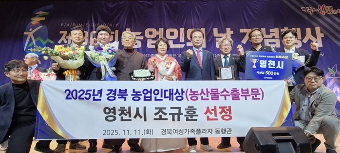 [파이낸셜경제=김지훈 기자] 영천시는 11일 경북여성가족플라자에서 개최된 제30회 농업인의 날 기념행사 ‘농산물 수출부문’에서 조규훈 영천친환경농업영농조합법인 대표가 농업인대상을 수상했다고 밝혔다.