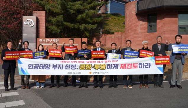 문승우 의장과 장연국 원내대표, 김동구 의원 등 도의회 더불어민주당 소속 의원 12명은 이날 한국연구재단 앞에서 도의회 입장문 낭독과 피켓 시위를 벌이며, 불공정한 부지선정 결과를 규탄했다. 이어 재단 측 관계자에게 항의 서한을 전달하고 원점에서 전면 재검토할 것을 촉구했다.