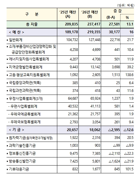 [파이낸셜경제=김영란 기자] 과학기술정보통신부는 정부안 대비 746억원 증액된 총 23조 7,417억원 규모의 과기정통부 2026년도 정부 예산 및 기금운용계획이 12월 2일 국회 본회의 의결을 통해 최종 확정됐다고 밝혔다.