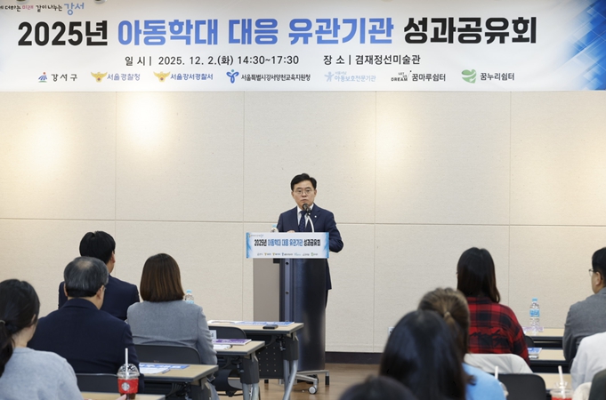 | ▲ 진교훈 서울 강서구청장이 2일 겸재정선미술관에서 열린 ‘아동학대 대응 유관기관 성과공유회’에 참석해 인사말을 하고 있다. |