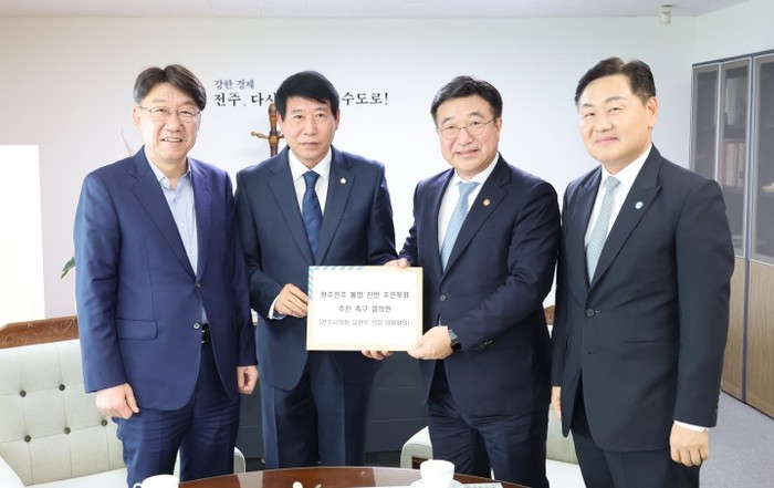 [파이낸셜경제=김예빈 기자] 남관우 전주시의회 의장이 24일 전주를 방문한 윤호중 행정안전부 장관에게 완주·전주 통합 주민투표 추진 촉구 결의안을 전달했다. 전주시의회는 앞서 22일 열린 제424회 임시회 1차 본회의에서 해당 결의안을 만장일치로 채택하고, 행정안전부장관 등에게 전달키로 한 바 있다.