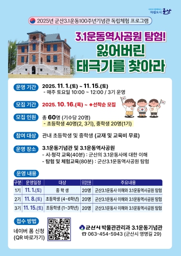 이번 프로그램은 초등학생과 중학생을 대상으로 독립운동 체험행사로 11월 1일부터 15일까지 매주 토요일(3기)까지 진행되며, 특히 10월 말 개관 예정인 군산선교역사관과 연계되어 운영될 예정이다.