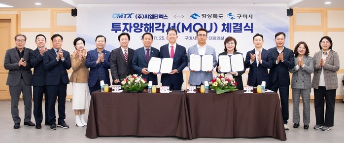 [파이낸셜경제=김지훈 기자] 경상북도와 구미시는 25일 구미시청 3층 대회의실에서 양금희 경상북도 경제부지사, 김장호 구미시장, 박교상 구미시의회 의장, 박성훈 ㈜씨엠티엑스 대표이사 등이 참석한 가운데 ㈜씨엠티엑스와 경상북도·구미시 간 투자양해각서(MOU)를 체결했다.