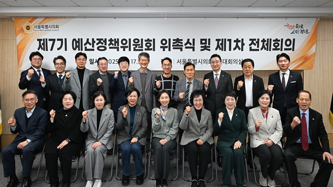[파이낸셜경제=김예빈 기자] 서울특별시의회는 2025년 12월 17일 제1대회의실에서 위촉식과 제1차 전체회의를 개최하여 시의회의 예산정책기능 강화를 위한'제7기 예산정책위원회'를 출범시켰다. 이날 최호정 의장(서초4, 국민의힘)은 위원들에게 위촉장을 수여했고, 이후 진행된 제1차 전체회의에서 신복자 의원(동대문4, 국민의힘)이 위원장으로 선출됐다.