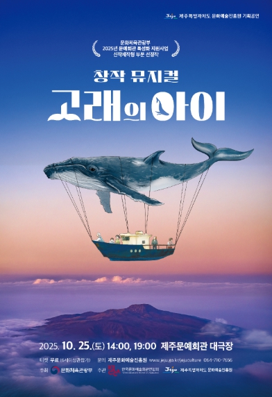 [파이낸셜경제=김영란 기자] 제주특별자치도 문화예술진흥원이 한국문화예술회관연합회 주관 ‘2025년 문예회관 특성화 지원 사업 신작제작형’ 공모에 선정된 창작뮤지컬 ‘고래의 아이’를 오는 10월 25일 문예회관 대극장에서 선보인다.