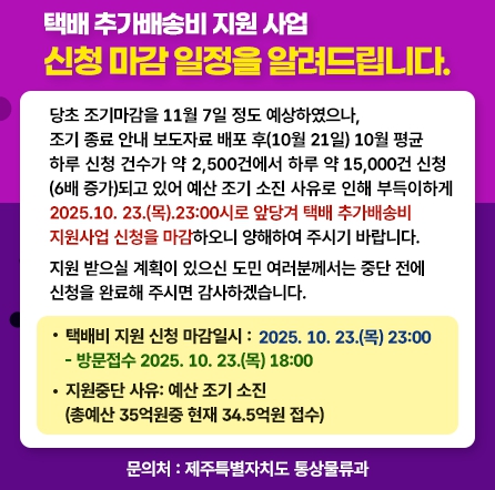 [파이낸셜경제=김영란 기자] 제주특별자치도는 택배 추가배송비 지원 사업이 당초 11월 7일 종료 예정이었으나, 신청 급증으로 10월 23일 오후 11시(방문 접수 오후 6시)에 조기 종료된다고 밝혔다.