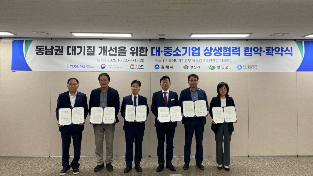 [파이낸셜경제=김예빈 기자] 경남도는 23일 낙동강유역환경청 대회의실에서 효성중공업(주), 낙동강유역환경청, 김해시, 양산시, 함안군과 함께 『대·중소기업 지역대기질 개선 상생협력 사업 연도별 참여 확약식』을 체결했다고 밝혔다.