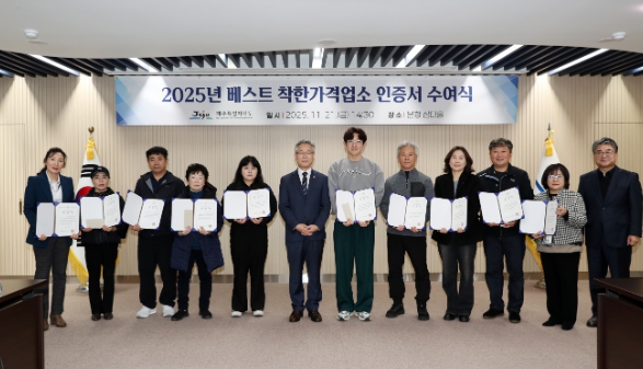 [파이낸셜경제=김영란 기자] 제주특별자치도는 도내 최초로 ‘2025년 베스트 착한가격업소’ 15개소를 선정하고 21일 인증서 수여식을 개최했다.