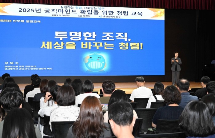 [파이낸셜경제=김예빈 기자] 울산 남구는 30일 구청 6층 대강당에서 전 직원 대상으로‘공직마인드 확립을 위한 제2차 청렴교육’을 실시했다.