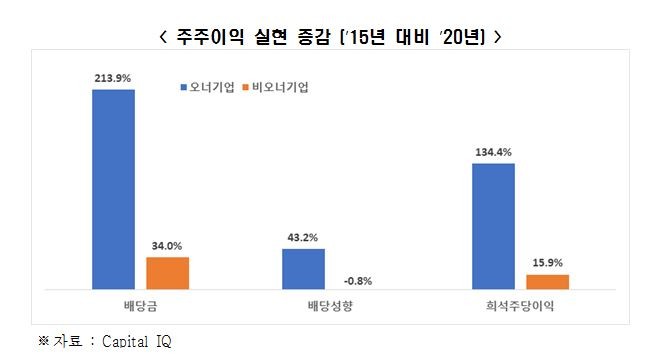 ▶[주주이익 실현] 오너기업은 배당금 규모(213.9%), 희석주당이익(134.4%)도 큰 폭으로 늘어 비오너기업 대비 배당금 증가율 6.3배, 희석주당이익 증가율 8.5배를 기록하여 주주이익 실현에 더 유리한 것으로 나타났다. 배당성향 또한 오너기업이 43.2% 증가한 반면, 비오너기업은 0.8% 감소했다.