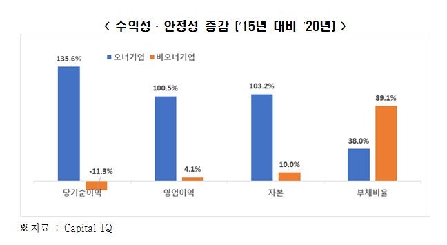 ▶[수익성] 오너기업은 당기순이익(135.6%), 영업이익(100.5%) 모두 비오너기업(당기순이익 △11.3%, 영업이익 4.1%)보다 크게 증가하여 수익성 측면에서 뛰어났다. ▶[안정성] 오너기업의 자본은 103.2% 증가하여 비오너기업(10.0%)의 10.3배를 기록했고, 부채비율 증가율은 38.0%로 비오너기업(89.1%)의 0.4배 수준에 불과하여 안정성 측면에서도 뛰어난 것으로 조사됐다.