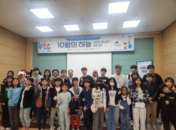 | ▲ 남부도서관 교육문화관에서 25일 열린 '10월의 하늘' 재능기부 강연 참가자들이 기념사진을 찍고있다. |