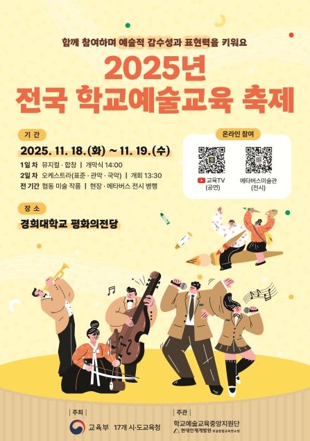 [파이낸셜경제=김영란 기자] 교육부와 17개 시‧도교육청은 11월 18일부터 11월 19일까지 경희대학교 평화의전당(서울)에서 2025년 전국 학교예술교육 축제를 개최한다.