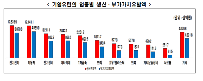 한편, 해외에 진출한 국내 제조기업의 5.6%가 한국으로 유턴할 경우, 발생하는 국내 생산 및 부가가치유발액은 각각 40.0조 원, 13.1조 원이었다. 주요 업종별 생산 및 부가가치유발액은 ▸전기전자 12.6조 원, 3.6조 원 ▸자동차 12.1조 원, 4.6조 원 ▸전기장비 3.2조 원, 0.9조 원 ▸기타기계 2.8조 원, 0.9조 원 ▸1차금속 2.3조 원, 0.7조 원 등의 순으로 분석되었다.