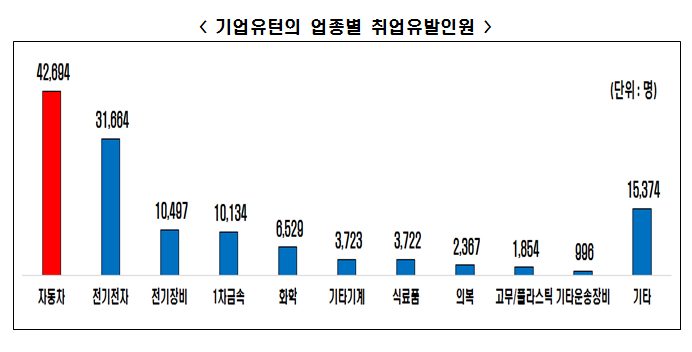 국내 제도적 요인 개선으로 해외 진출 국내 제조기업의 5.6%가 한국으로 유턴할 경우 업종별 취업유발인원은, ▸자동차 4.3만 명 ▸전기전자 3.2만 명 ▸전기장비 1.0만 명 ▸1차금속 1.0만 명 ▸화학 0.7만 명 등의 순으로 나타났다.
