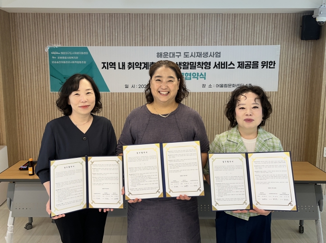 [파이낸셜경제=박영진 기자] 해운대구도시재생지원센터(센터장 정혜경)는 9월 30일 운봉종합사회복지관(관장 박일영), 반송솔찬마을관리사회적협동조합(이사장 강선희)과 도시재생사업 지역 내 취약계층을 대상으로 한 생활밀착형 서비스 제공을 위한 업무협약을 체결했다.