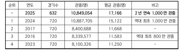 [파이낸셜경제=금윤지 기자] KBO 리그가 단일 시즌 역대 최다 관중 신기록 수립을 눈앞에 두고 있다.9월 4일(목)까지 KBO 리그는 632경기만에 1,084만 9,054명의 관중이 야구장을 찾아 기존 단일 시즌 최다 관중 기록이었던 2024시즌의 1,088만 7,705명에 3만 8,651명을 남겨 뒀다. 출범 첫 시즌이었던 1982년 총 143만 8,768명의 관중으로 시작했던 KBO 리그는 마흔 네번째 시즌 만에 2년 연속 1,000만 관중을 넘어서는 프로스포츠 리그로 성장했다.