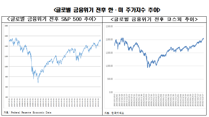 보고서는 향후 코로나19에 따른 금융시장 변동성도 상당할 것으로 예상하면서, 위기 이전의 안정세를 회복하는 데는 상당한 시일이 걸릴 것으로 전망하였다. 주식시장의 경우 주요국의 경기부양책에 따라 주가의 단기적 급등이 발생할 수 있으나, 실물경제의 호전 없이는 결국 하향 추세를 벗어나기는 어려울 것으로 예상했다. 특히 주가의 경우 글로벌 금융위기 당시 위기 이전 수준을 회복하는 데는 상당한 시간(S&P 500의 경우 약 5년, 코스피의 경우 약 3년, 아래 표 참조)이 걸린 점을 감안하면 이번 위기의 경우에도 주식시장의 장기침체 가능성이 크다고 주장하였다.