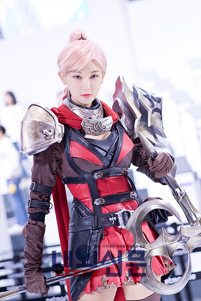 넷마블 부스의 모델 문가경이 포즈를 취하고 있다.