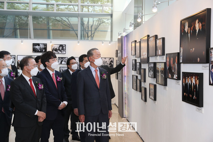 | ▲사진. 허창수 전경련 회장, 이준석 국민의힘 대표를 비롯한 내빈들이 14일 전경련회관에서 열린 '전경련 창립 60주년 사진전'에 참석해 사진전을 관람하고 있다. 왼쪽부터 윤재옥 정무위원장, 이준석 국민의힘 대표, 허창수 전경련 회장 |