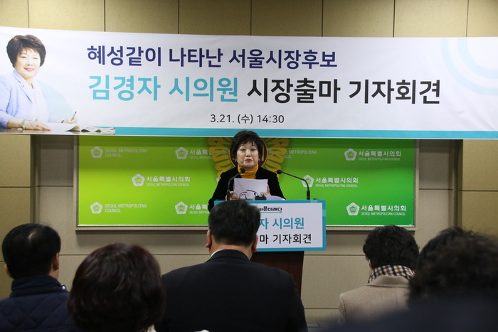 김경자 시의원은 ‘엄마가 살아야 교육이 산다는 케치프레이즈’로 9대 서울시 의회에서 문화체육관광위원회 위원으로 활약하고 있으며 이날 출마 기자회견에서 “돈을 쓰는 시장이 아닌 돈을 벌어들이는 시장이 되겠다”고 약속했다.
